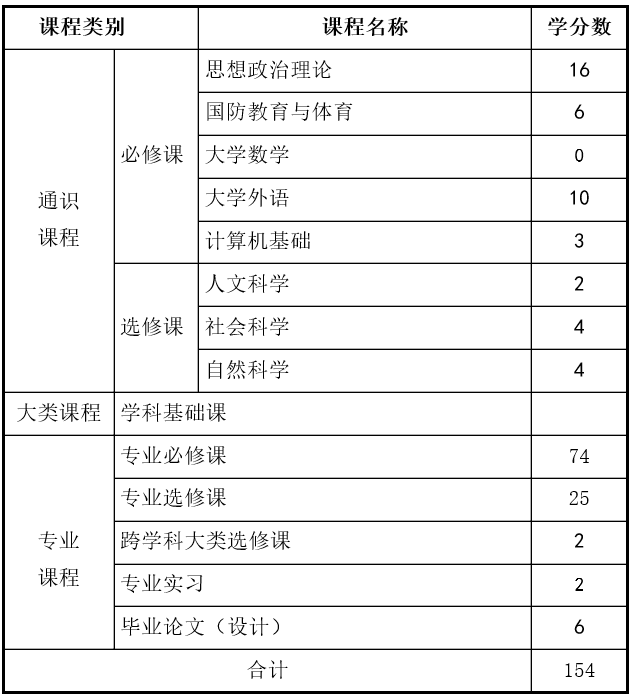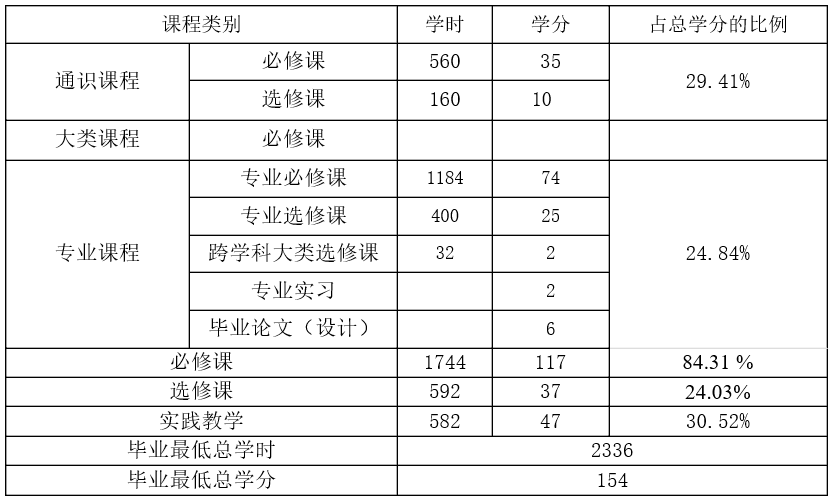 本专业总学时2336学时,总学分154学分。其中必修课程 117学分,占75.98%;选修课程37学分,占24.03 %;实践教学47学分,占30.52 %。