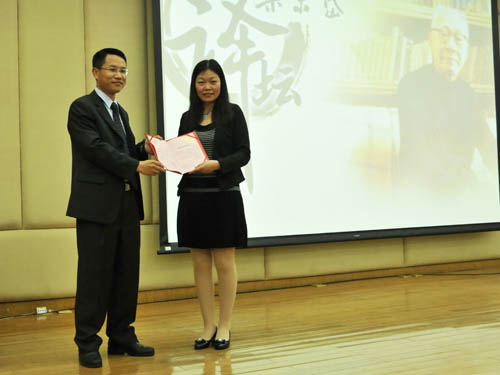在观众们的热烈掌声中,主讲人黄荭老师开始了今天的讲座。在讲座的一开始,黄荭老师以“诗与真”“文与人”为题追忆了梁宗岱先生的译作、文学创作,然后又引述到自己的翻译生活,称自己的翻译为“自以为‘我注六经’,其实是‘六经注我’”。黄荭老师认为,翻译是一种双向的交流,在翻译也应该“拥有自我”,要进行“有温度的翻译”。而讲到翻译中译者与作者的关系,她说要“平等的对待”,并展示自己与法国杜拉斯研究学者的合影,讲述自己与各位作者之间平等友好的交流,她强调也正是因为平等的对待,才使作品可以更好的被转译到另外一种文字。在演讲的最后,黄荭老师还展示了南京大学学生的翻译作品,带领观众们体会诗歌翻译的奇妙。演讲结束后,黄荭老师走下台,与老师和同学们进行交流问答。讲座结束后,图书馆馆长为黄荭老师颁发了赠书荣誉证书,感谢黄荭老师为广外图书馆的贡献。