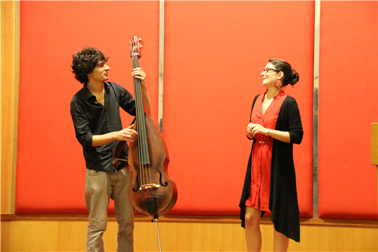 接下来,两位来自意大利的80后著名爵士音乐家Federico Stocchi和Marta Del Grandi为在场学生进行了一次精彩的讲座。讲座中两位音乐家主要讲述了爵士音乐家的起源,并介绍了爵士乐的两大特色:集体与即兴。另外,Federico Stocchi还讲述了他对爵士乐从一无所知到痴迷的过程,体现了他对爵士乐由衷的热爱。