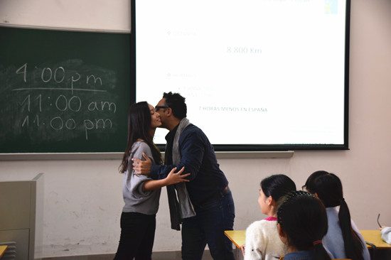 在一段风趣幽默的自我介绍后,Mario先生为大家介绍了西班牙的地理位置及其与中国的时差。他提到西班牙的用餐时间比中国晚两到三个小时左右,这种独特的作息时间充分引起了大家的兴趣。接着,他对比了中西两种不同的打招呼方式,并亲自示范了西班牙贴面礼。