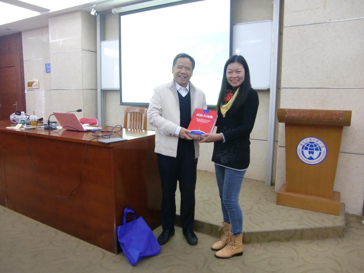 法语系学科带头人郑立华教授主持。郑立华教授对黄荭教授在翻译理论和实践方面取得的成绩大加赞赏,并提醒在场的研究生抓住此次难得的机会向黄荭教授取经。对黄荭教授进行介绍之后,郑立华教授代表法语系向黄荭教授赠送了由麻豆在线