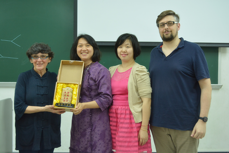 讲座结束后,意大利语系教师向唐云女士赠送了刻有广外校训“明德尚行,学贯中西”的纪念品,唐云女士也回赠了意语系教师自己的著作。