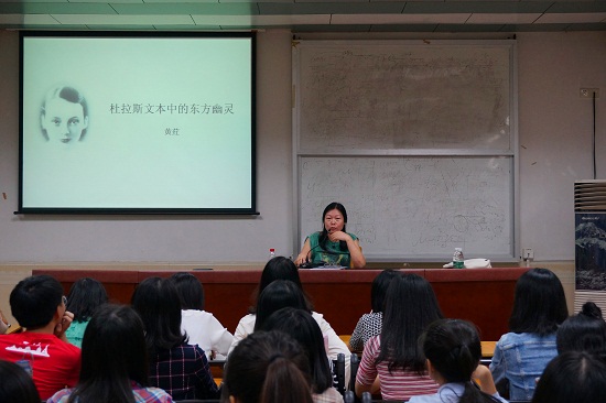 黄荭教授首先介绍了国内外的杜拉斯学术研讨会以及各种交流纪念活动,随后列举出杜拉斯的文学、影视、戏剧作品,以及与其相关的文献及评论,最后精心选取一系列作品的片段,以具体分析杜拉斯所描绘的不同的“情人”形象。讲座结束时,黄荭教授还为同学们推荐了一系列相关文学作品及参考文献,以方便同学们拓展兴趣或加以研究。