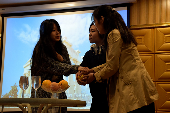 最后,希腊语系的同学们展示了他们精心准备的节目。大一的同学们表演了根据希腊神话改编的舞台剧《金苹果之争》, 同学们演技精湛,生动地展现了赫拉、雅典娜、阿芙洛狄忒三位女神为争夺金苹果而引发的一系列事件。大二的同学们则热情洋溢地演唱了希腊歌曲Μαλαματένια Λόγια 以及Κι ξεχνώ,同样受到了好评。