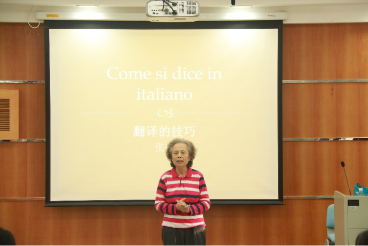 意大利语系全系师生聆听张密教授讲授的 “翻译的技巧”讲座。张教授现任吉外意大利语系系主任,同时也是对外经贸大学的意大利语系退休教授,先后担任中国意大利语教学研究会会长、中国意大利研究会副会长等要职,三次荣获意大利总统颁发的骑士勋章和爵士勋章。