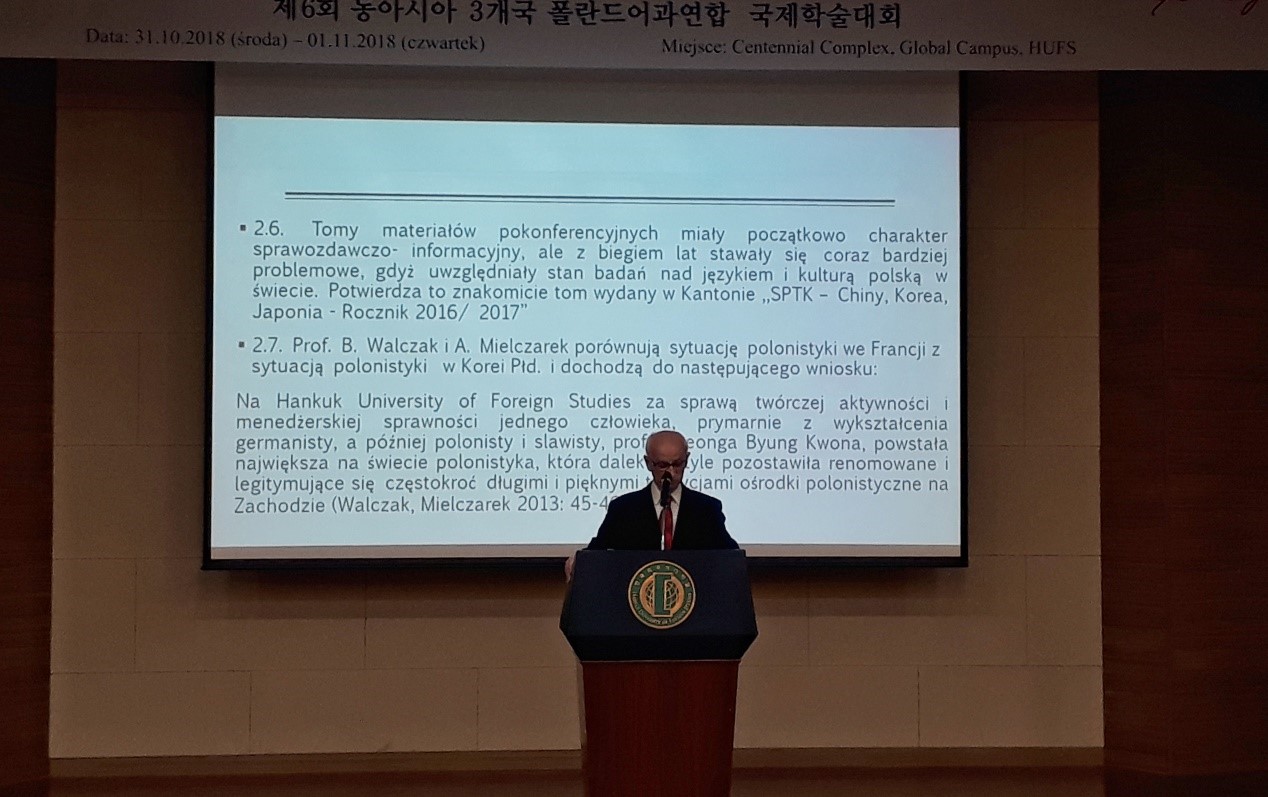 波兰驻韩国大使彼得·奥斯塔舍夫斯基(Piotr Ostaszewski)、波兰驻朝鲜大使克日什托夫·切宾(Krzysztof Ciebień)、波兰驻日本大使亚采克·伊兹多尔切克(Jacek Izydorczyk)、日本波兰文化中心主任玛利亚·茹拉弗斯卡(Maria Żurawska)、波兰驻华大使馆文化参赞马志伟(Jan Jerzy Malicki)、韩国外国语大学副校长金钟硕(Kim Jong Suck)出席开幕式并致辞。他们肯定了中日韩三国波兰语学术研讨会对人文交流,特别是亚洲地区的波兰语教学研究做出的贡献。波兰国家高等教育交流委员会(Narodowa Agencja Wymiany Akademickiej,以下简称NAWA)波兰语推广部主任卡米拉·邓宾斯卡(Kamila Dembińska)女士介绍了NAWA在高校合作交流方面所提供的项目支持。雅盖隆大学弗瓦迪斯瓦夫·米奥顿卡(Władysław Miodunka)教授发表主旨演讲,他强调了中日韩三国波兰语学术研讨会在波兰语全球区域研究中具有重要地位,并表达了对过往几届学术研讨会成果的肯定和对新一届中日韩波兰语学术研讨会的由衷的期待与祝福。