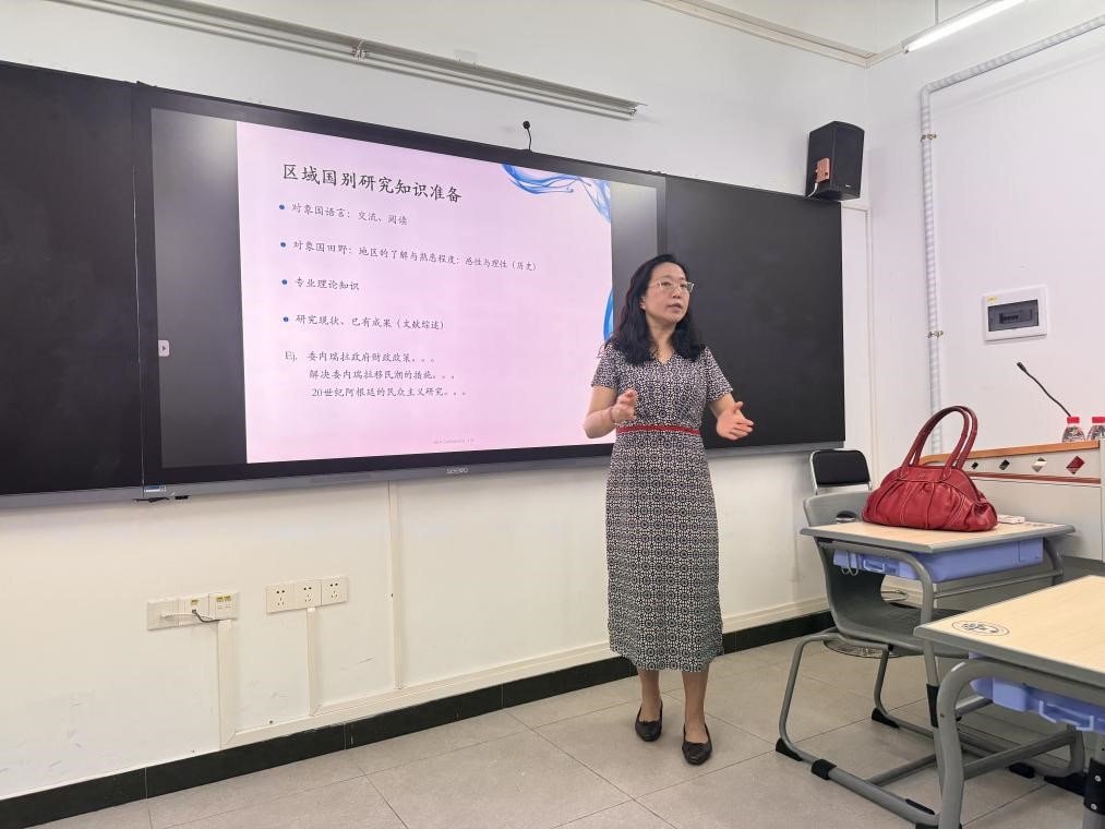 师生阐释了区域国别学这一门新增交叉学科的历史,让我们对这门学科有了更好的认识与了解。李紫莹教授从语言学习者的角度出发,与我们分享语言学对区域国别研究的优势。由于掌握对象国语言,再辅以专业理论知识,研究该学科的学者更容易开展田野调查,研究现状,输出成果。李紫莹教授强调,国家现在急需高水平区域国别学研究人才,我们要响应国家号召,把握机会,精进水平。