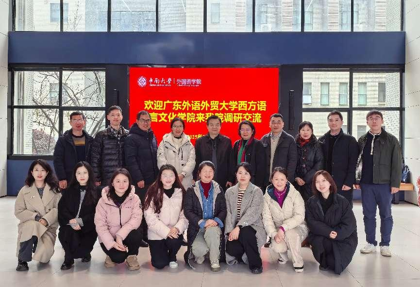 当天下午,调研团队前往湘潭大学外国语学院进行交流。湘潭大学外国语学院院长舒奇智、党委书记李锋及相关系部负责人出席了座谈会并详细介绍了学院在课程设置、教学改革及学生培养方面的创新举措。