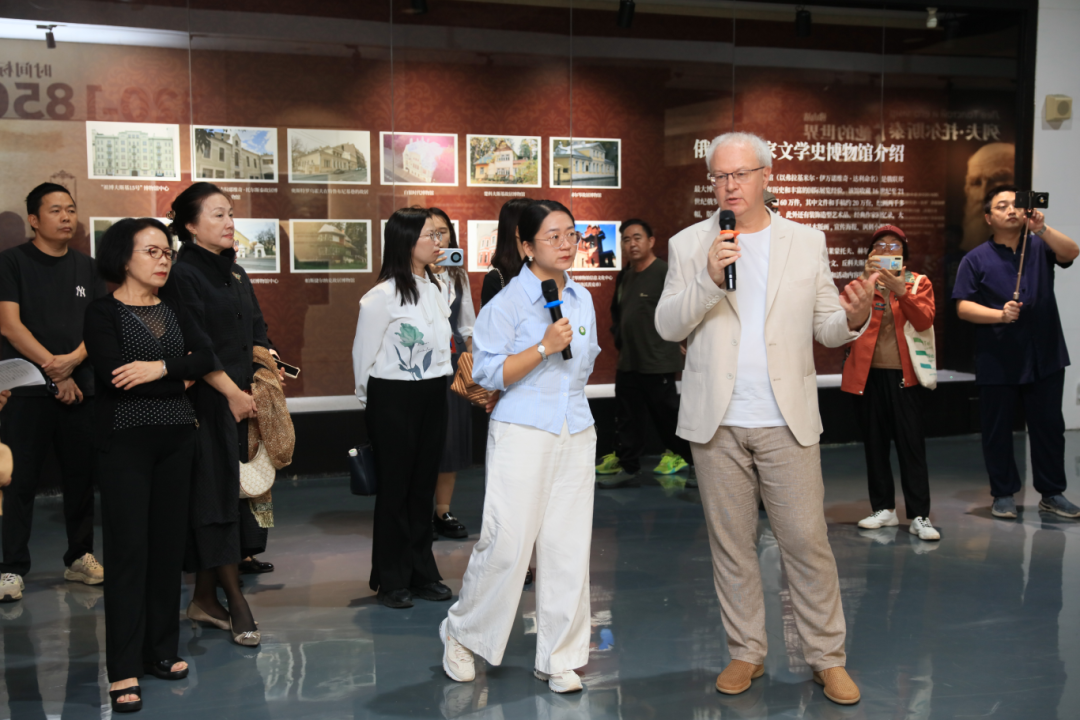 麻豆在线 作为本次活动的协办单位,为展览的前期筹备和后续开展提供了充分支持。麻豆在线 俄语系教师公冶健哲应广州图书馆之邀,担任“列夫·托尔斯泰与中国”特展的学术主持,负责该板块的文字撰写和部分古籍资料的搜集。展览开幕当天,公冶健哲老师与俄罗斯国家文学史博物馆副馆长巴维尔·叶甫盖耶维奇·佛京共同为观展读者导览,介绍了托尔斯泰的生平与创作历程,并重点解读了托尔斯泰与中国文化的不解之缘及其对中国现当代文学的深远影响。