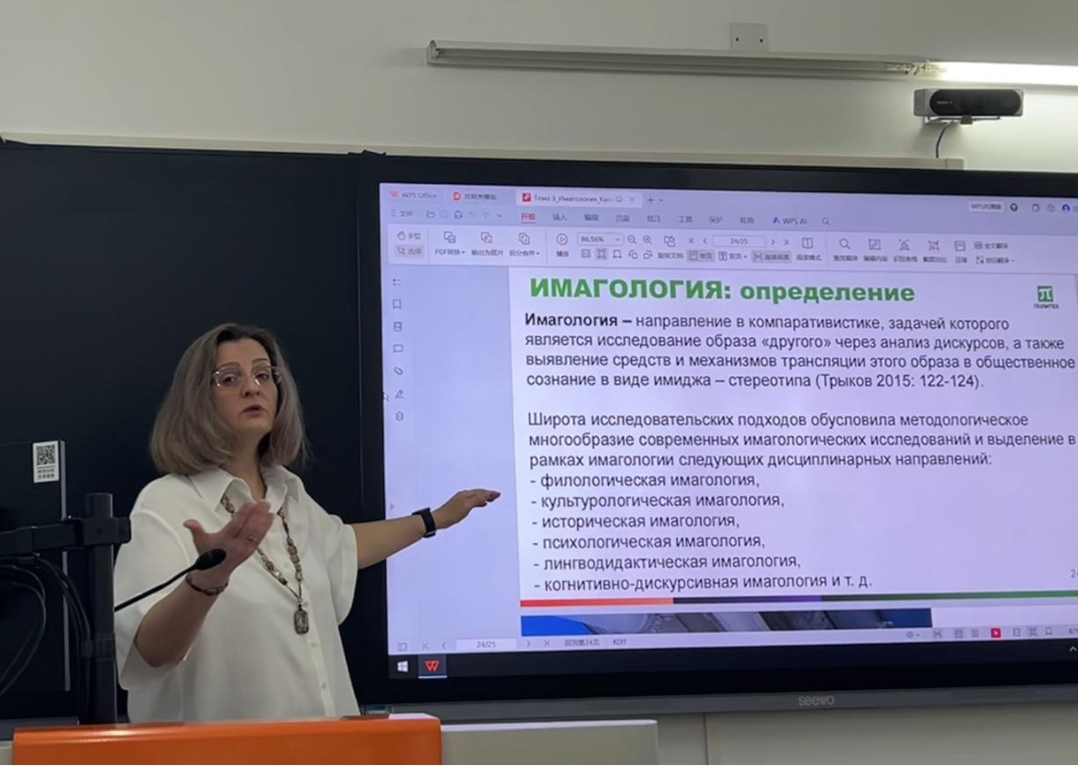 作为俄罗斯著名语言学家,玖芭教授在认知语言学与媒体话语安全等领域著述颇丰,已发表学术论文180余篇,并担任多本国际高水平期刊编委。讲座中,她以深入浅出的方式阐释了语言在人类认知过程中的关键作用,重点解析了“范畴化”与“概念化”两种基本认知过程。玖芭教授指出,尽管不同语言、民族、文化和国家之间存在诸多差异,但人类认识世界的基本方法与思维方式具有高度共通性。她以具体语言现象为切入点,逐步延伸至政治与国际关系中的典型话语表达,从认知语言学视角揭示:语言不仅是交流的工具,更是构建现实、理解世界的重要框架。她进一步强调,语言不仅是信息传递的媒介,更是一种认知结构,能够塑造人们对现实的感知,并具备预见未来的能力。