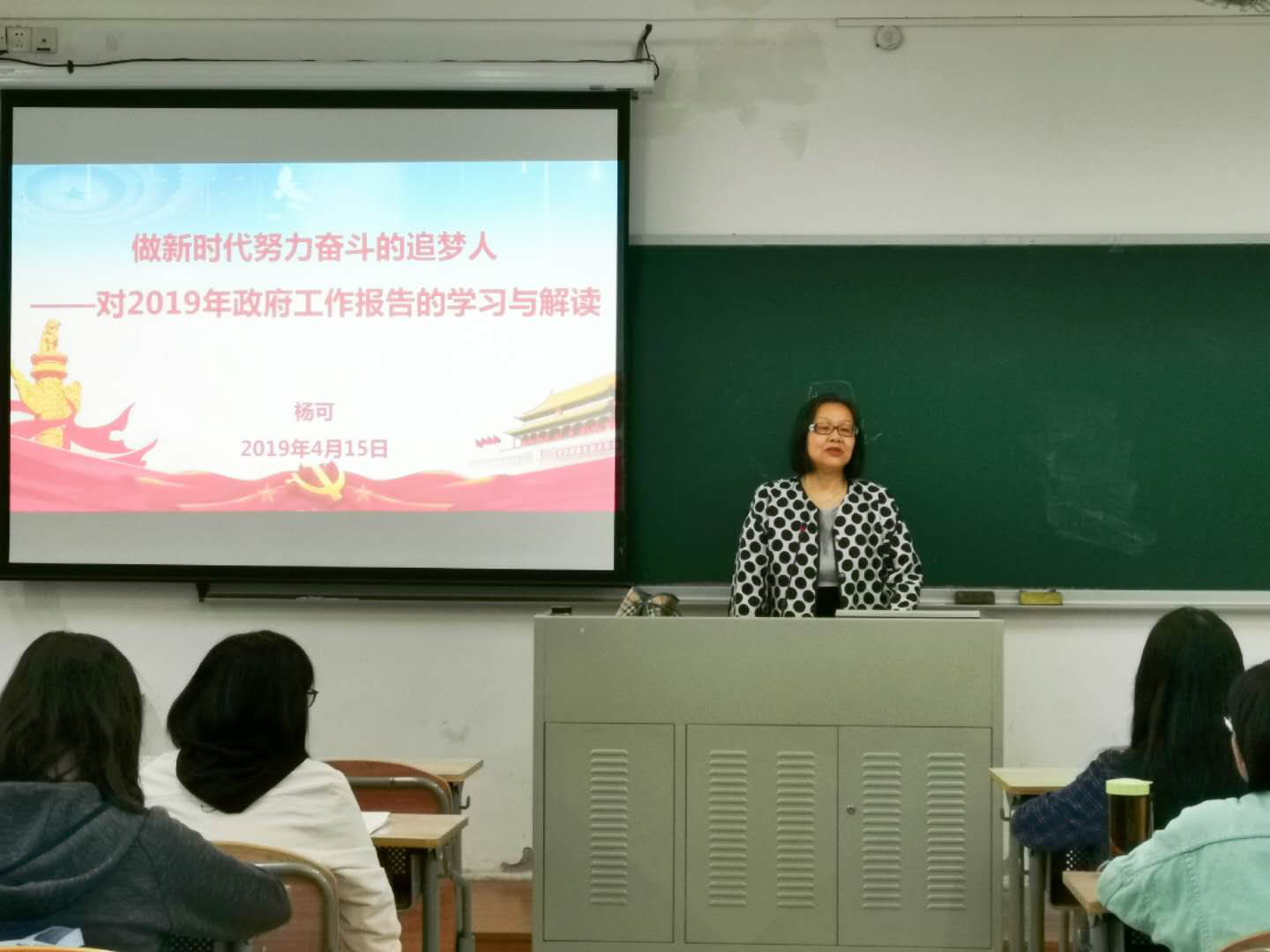 杨可作了题为《做新时代努力奋斗的追梦人——对2019年政府工作报告的学习与解读》的授课,结合学院学生专业特点以及她在中央党校学习的切身体验,向同学们指出,要落实“一带一路”合作倡议,我们缺的不是政治智慧,从深层次看,缺的是“心灵相通”。在“一带一路”合作倡议的实施过程中,外语,特别是非通用语的战略支点作用日益显现,对该战略的整体实施和推进将起到关键性的作用,因为只有语言相通、文化相通才能实现真正意义上的“民心相通”。“一带一路”合作倡议的提出为我们非通用语种学科建设和人才培养提供了难得的发展机遇,也带来重大挑战,进而鼓励同学们广大青年要勇敢肩负起时代赋予的重任,志存高远,脚踏实地,努力在实现中华民族伟大复兴的中国梦的生动实践中放飞青春梦想。