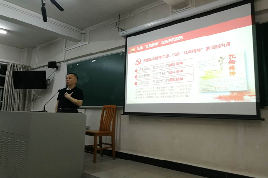 4月26日,学院党委书记方华作了题为“红船精神,代代相传”的授课。他从2017年党的十九大闭幕仅一周,习近平总书记带领新一届中共中央政治局常委专程前往上海和浙江嘉兴,瞻仰中共一大会址和嘉兴红船,回顾建党历史,重温入党誓词,宣示新一届党中央领导集体的坚定政治信念讲起,谈到红船精神所昭示的是永不褪色的精神丰碑。重温红船精神,坚定理想信念,进一步推动党的十九大精神学习宣传贯彻,为实现党的十九大提出的奋斗目标、实现中华民族伟大复兴的中国梦提供强大精神动力。