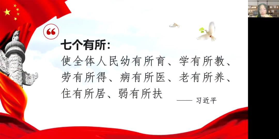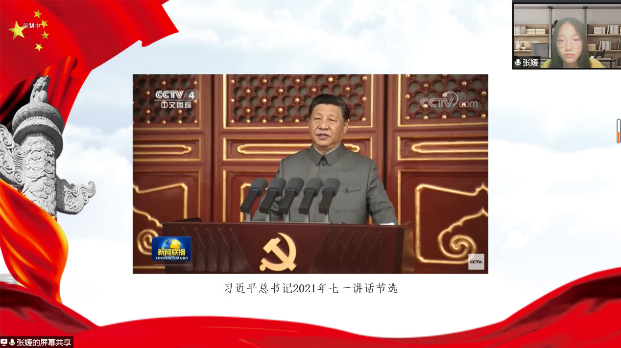 张媛节选了习近平总书记在庆祝中国共产党成立一百周年大会讲话视频的片段,视频中习近平主席庄严宣布我国实现了第一个百年奋斗目标,在中华大地上全面建成了小康社会。重温这段激动人心的讲话,使各位党员同学们感受到全面建成小康社会意义非凡,对中华民族来说具有划时代的意义。而在全面小康的基础上,我们也在描绘着新的时代蓝图,为把我国建设成为富强民主文明和谐美丽的社会主义现代化强国而努力奋斗。