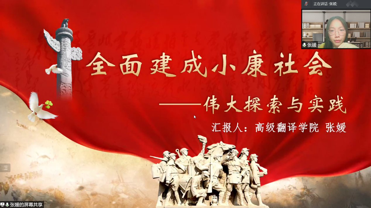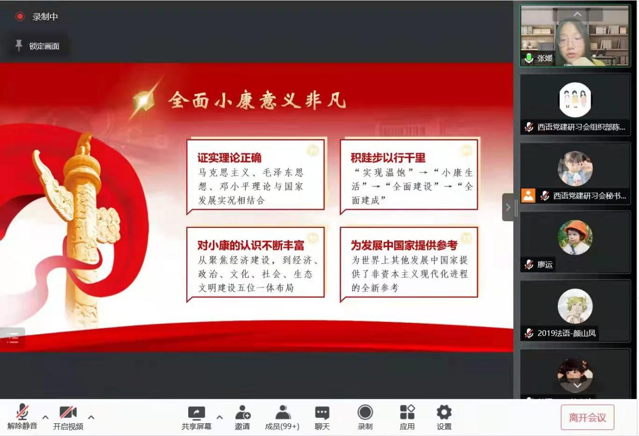 邀请“百年党史大学生宣讲团成员、高级翻译学院张媛为学院党员学生开展题为“全面建成小康社会——伟大探索与实践”线上专题党课,共计158名党员参与。