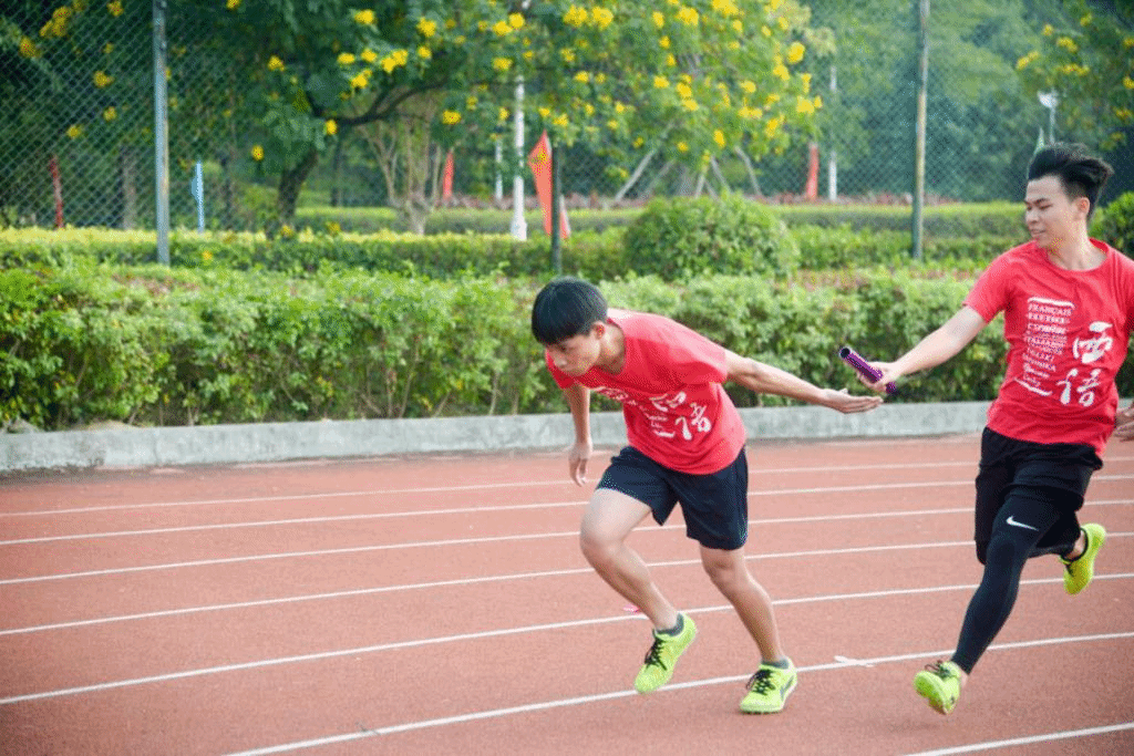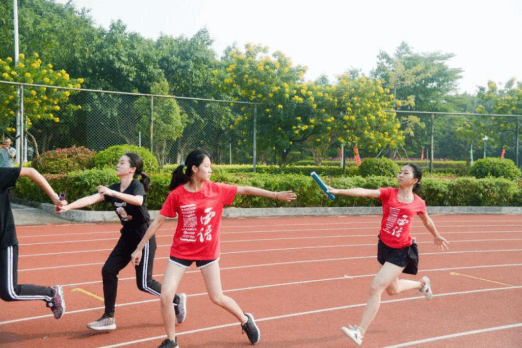参加男子4x100决赛。枪声一响,田径场上你追我赶,观众席上鼓乐齐鸣,大家都为这精彩绝伦的比赛欢呼呐喊。西语健儿们也不甘落后,用尽全力,在接住木棒的那一刻,像一匹匹奔腾的马,向下一个目标极速前进。一根小小的木棒,连接的是团结和友爱,传递的是勇气和力量,演绎的是奋斗和拼搏。女子组获得了单组第一的佳绩,场上再次掌声雷动。