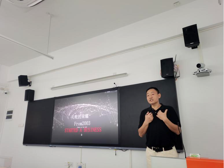在讲述其本人毕业后在深圳求职的经历时,他鼓励在座的同学们,找工作时要多尝试、多发现,相信自己总会找到适合自己的职业发展道路。随后,刘耘分享了从第一次创业到最近一次创业的心路历程,他指出“创业要用希望战胜恐惧”,创业路上不可避免地会遇到各种困境和挑战,因此保持耐心和冷静十分重要;强调良好的团队合作和人际关系的重要性,只有建立良好的人际关系,慎重选择合作伙伴,才能更好地开展合作,为创业带来更多的机遇和资源。刘耘提醒有创业计划的同学,创业前要对行业有充分的了解、创业过程中要有足够的精力投入,同时要兼顾好事业和家庭、生活等各方面。