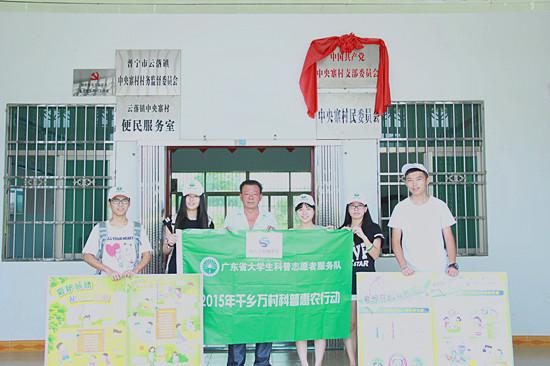 一起床就看见晴空万里,难得的阳光驱散了全明星对普宁云落这块地儿频繁的“黄色暴雨预警”的烦闷,崭新的一天伴随着难以抑制的好心情开始!到厨房的一路上都能听到清脆悦耳的鸟鸣声,全明星服务队进行雷打不动的早上例会后,科普小分队便带上“装备”进军云落中学附近的最大村子——中央寨村。首先,来到中央寨村村委会拜访了中央寨村的书记,并由该村委会工作人员带领着去位于村子中央的广场。