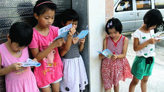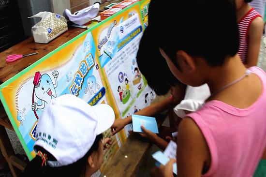 访问完老人们后,为了增加更多受益人群,科普小分队决定换个地方继续科普。这次选在了一个路边上有零售小店、面坊等的三岔路口,据当地村民说,临近午时将会有很多人下班回家吃饭会从这里经过。果然,附近不少的村民听说了之后就积极过来参与科普活动,更有很多人从这路过时特意停车来帮助科普小分队完成问卷调查。最令人感动的莫过于一大群小朋友们乖乖地围成一圈,听科普小分队给他们科普爱护牙齿和爱护眼睛等相关知识。孩子们特别喜欢这些精美的宣传小册子,还特意一页页地读出声来,遇到不认识的字就积极地问科普小分队怎么读。