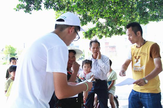 由于白天气温较高,广场上的村民并不多,只有几位老人在树荫下乘凉。在对他们进行问卷调查的过程中,发现老人们并不会讲普通话,这使科普小分队的工作遭到了打击。多亏了村委会的工作人员大哥,特意帮科普小分队做翻译,告诉老人们科普小分队是大学生志愿者,特意前来科普爱护牙齿、爱护眼睛等健康知识以及免费分发药品。