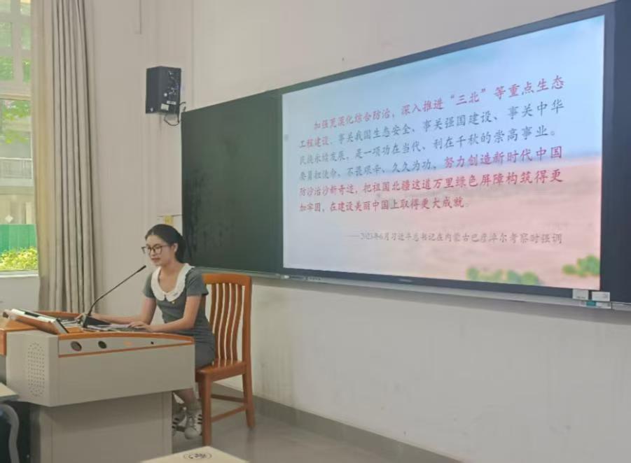 谭秀薇同学强调,“‘植’此青绿,不止线上”。她向同学们介绍了甘肃民勤的“请到民勤种棵树”公益活动,生动诠释了生态建设不应仅仅局限于线上,更可以躬耕于线下,以实际行动为生态建设添砖加瓦。正是这种“互联网 +”模式,将线上的环保理念转化为线下的实际行动,为生态建设开辟新的路径,吸引了众多志愿者从全国各地赶来甘肃民勤种树。这些志愿者们怀着对生态建设的热忱,有的甚至愿意在民勤驻留一个月,只为用双手为沙漠种下一棵树,为改善生态环境贡献自己的一份力量。