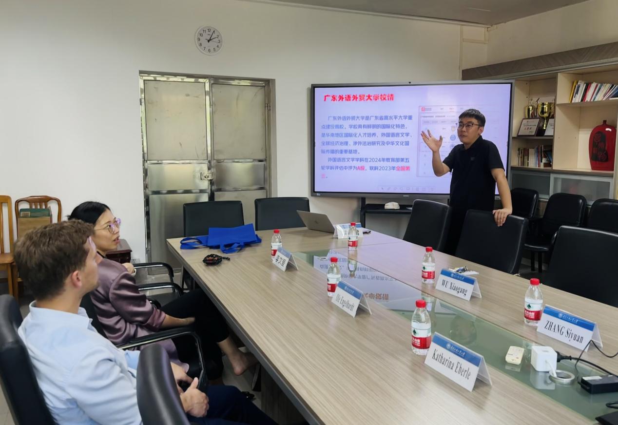 在随后的交流会上,德语系与DAAD代表团展开了深入交流。吴晓钢老师详细介绍了德语系的办学情况。他提到,广外德语专业凭借雄厚的师资力量、卓越的教学质量、丰富的文化活动和国际交流项目,为学生提供了广阔的知识视野和多样化的学习体验。针对本科教学,吴老师还重点介绍了今年首次招生的“德语+国际经济与贸易”双学士学位项目。这一专业改革举措引起了DAAD代表团的浓厚兴趣,他们对课程设置、培养模式等方面进行了详细提问,并对该项目在促进学生综合能力发展以及提高就业竞争力方面的作用表示赞赏。