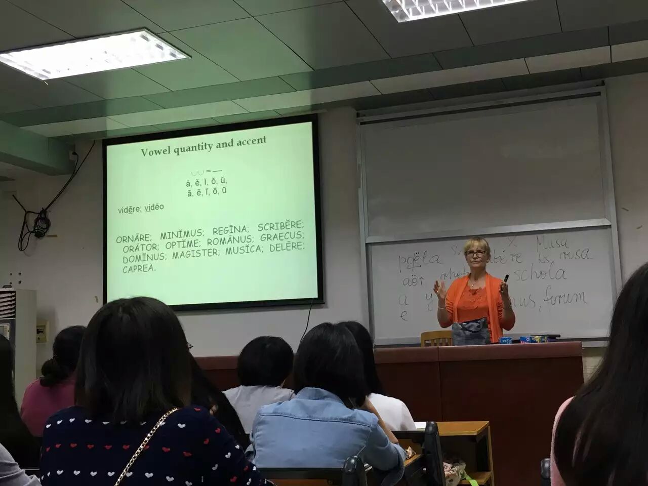 在这首次课上,老师为大家介绍了拉丁语的历史,并通过一些简单练习和例子让同学们初步认识拉丁语,还分享了她自己对拉丁语的看法。她说,拉丁语就像数学一样,看似复杂,但其实都包含了规则。