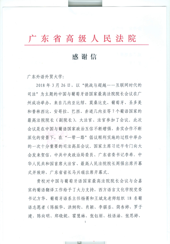 附:广东省高级人民法院感谢信