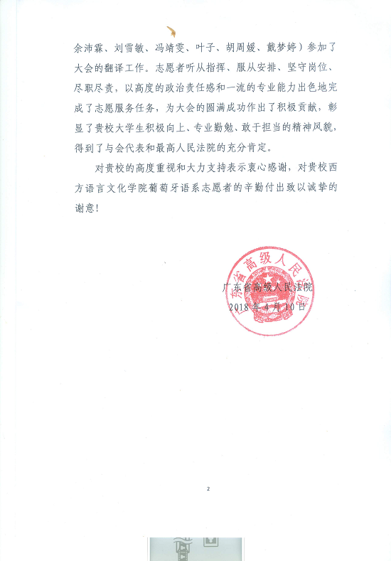 党委书记方华老师、葡萄牙语系主任杨菁老师、团委书记王斌龙老师组织学生参加中国与葡萄牙语国家最高法院院长会议翻译志愿活动 和葡萄牙语系15名14级大四学生和3名16级大二学生在本次会议提供的翻译志愿活动和所作出的努力表示感谢。