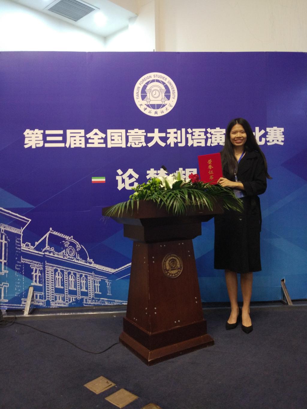 2015级意大利语专业学生张莉从全国众多选手中脱颖而出,一举斩获一等奖。