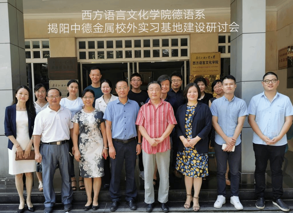 召开“揭阳中德金属校外实习基地建设研讨会”。敖湘晖书记,陈华荣副书记,全国高等学校外语教学指导委员会德分委副主任委员刘齐生教授,副院长杜卫华副教授,德语系主任卢铭君教授,德语系“揭阳中德金属校外实习基地”项目组成员以及高翻学院张林茂副书记,法语系主任叶剑如副教授,西班牙语系张梦璐老师等兄弟院系领导、嘉宾与企业代表——揭阳中德金属集团副总裁杨志新先生等就校企合作探索人才培养新模式以及实习基地建设与管理、实践课程建设与优化等问题展开了研讨与磋商。