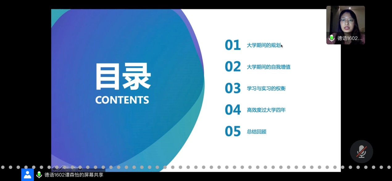 分享会上,参与本次会议的学子共同观看了表彰大会视频。随后,国家奖学金获得者德语1602谭森怡、希腊语1701朱天昊以及国家励志奖学金获得者意大利语1801黄文熙依次发表演讲,详细、精彩地分享了自己对于学习的独到见解以及经验心得。