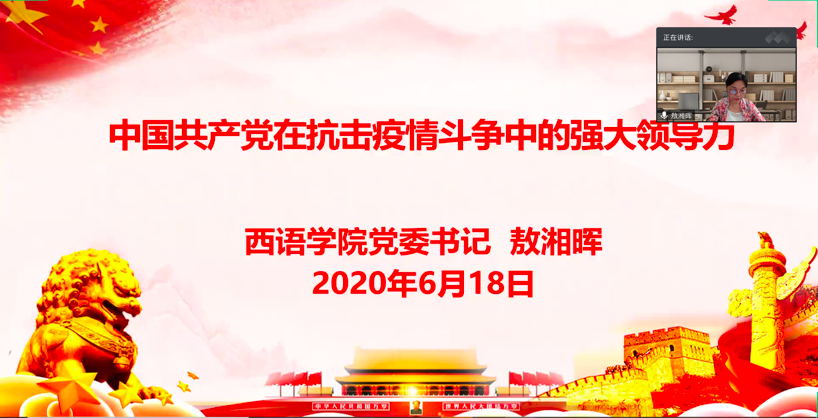 敖湘晖书记以“中国共产党在抗击疫情斗争中的强大领导力”为题,从中国抗击疫情的艰辛历程出发,指出在重大疫情面前,党中央领导集体英明的领导力,是抗疫取得重大成果的定海神针,党的各级组织高效的组织力和执行力,是抗疫取得重大成果的坚强保证,广大共产党员和党员干部的先锋模范力,是抗疫取得重大成果的中坚力量,引导广大青年学子不忘初心、牢记使命、志存高远、脚踏实地。