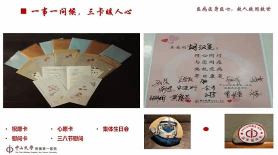 生活上,为了避免交叉感染,医护人员们下班后都被隔离在自己单独的房间里,严禁串门。无人聊天的孤独却没有让他们丧失乐观的心态,反而更加坚定了信仰。武汉支援期间,医疗队总是顾不上自己的行李,反而优先运送医疗物资;还积极组织党建活动,数人火线入党,更加体现出对中国共产党的忠诚和自己的一片炙热之心。医护人员、病人的心理压力也值得重视,前线便有专门的心理医生,医疗队还设计通过简单的心愿卡鼓励、安慰病人。无论条件多艰苦,医患之间都互帮互助和谐友爱,有凝聚力也有精神斗志。时值冬春交替,武汉天气寒冷,时有雨雪,中山大学附属第一医院重症救治医疗队成员都常年驻扎广东,很少见过雪,粤鄂气候差异大,医疗队的医护们必然水土不服,但他们上班风雨无阻,克服天气寒冷,正如谭医生坚信的:“没有一个冬天不可逾越,没有一个春天不会到来,没有一个黑也不会过去,没有一个黎明不会到来。”