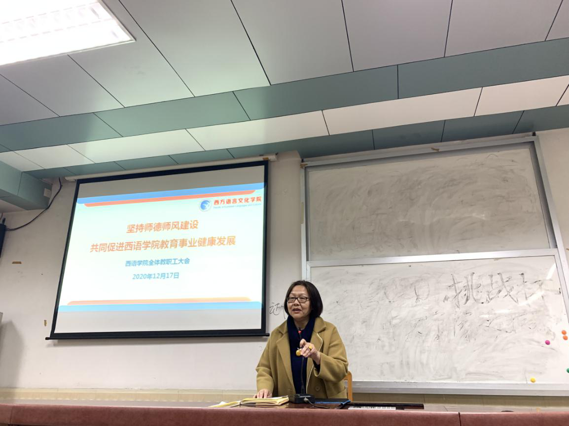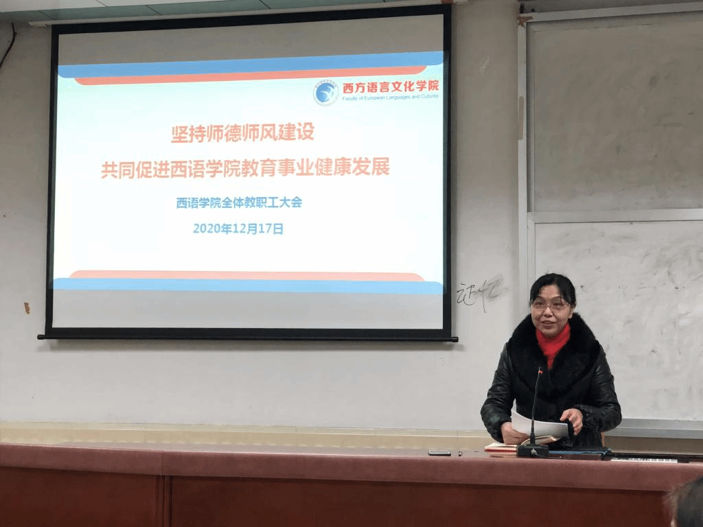 大家庭表示热烈的欢迎,相信新教师的加入一定会为学院的发展增添更强劲的动力。随后,学院副院长杨晓敏、杜卫华、茅银辉、党委副书记陈华荣分别做了发言。在教学方面,杨晓敏首先分享了葡萄牙专业获批省一流专业的信息,强调了期末考试和教学实践周的注意事项;在研究生管理方面,杜卫华提醒教师要做好教学督导、教学评估和新聘硕导和博导的工作;在科研和外事工作方面,茅银辉指出学院教师科研成果在全校表现优异,通报了“微专业”人才培养方案,强调并规范了外事和讲座的报备流程;在学生管理方面,陈华荣分享了学院在学生工作质量奖中获得优秀的好消息,通报了新生军训工作的安排,强调了诚信考试的要求,培养学生良好的学风、考风,要求在教学实践周中,不能随意批假。