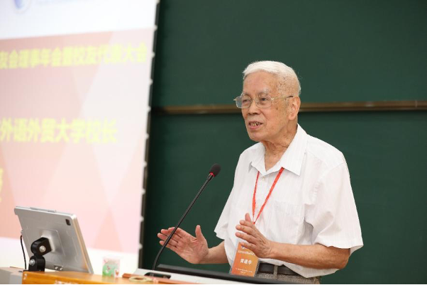 党委书记、校长、现浙江越秀外国语学院校长徐真华讲话。徐真华教授引用法国作家名句阐述校友会的工作意义,他将校友会比作“生生不息的生命之河”,希望更多代表新生力量的新校友加入校友会,努力张扬广外精神、西语风格;希望校友们走向社会后,不忘初心使命,寻找人生意义、创造生命价值;希望优秀校友更好的帮助一代代毕业生,搭建好桥梁纽带,将广外西语的优良传统传扬到世界各地。