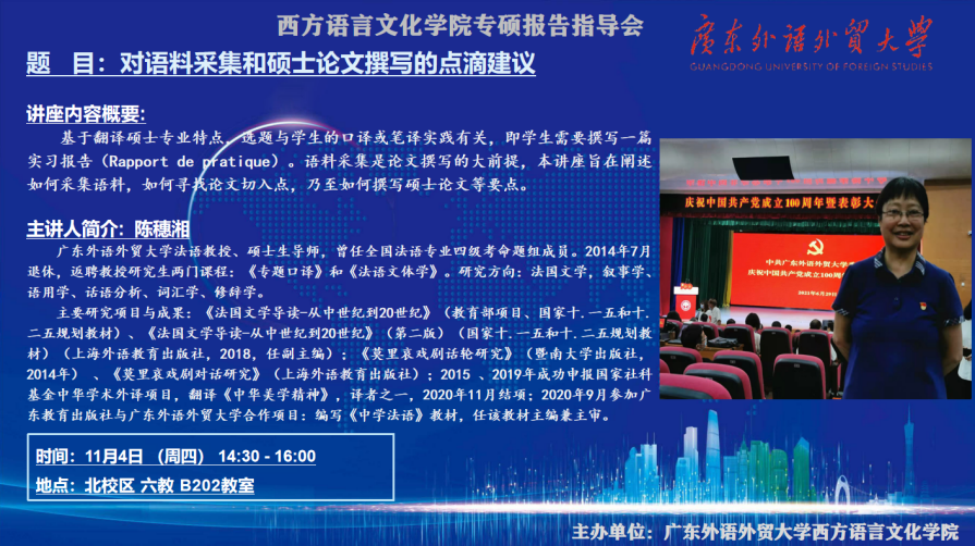 法语系陈穗湘教授主讲,题为《对语料采集和硕士论文撰写的点滴建议》。讲座由法语系陈湘蓉老师主持,麻豆在线