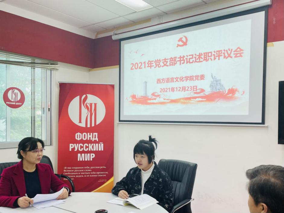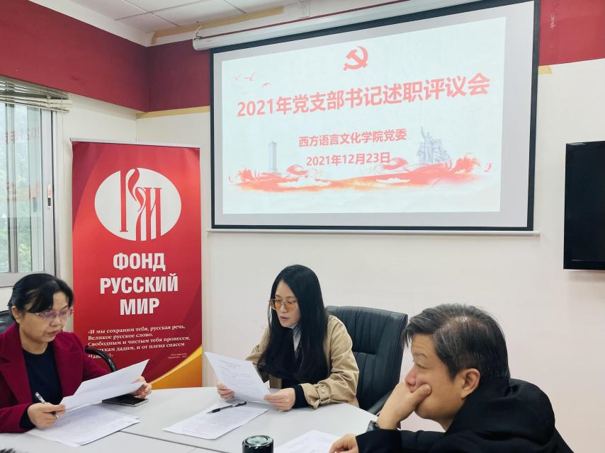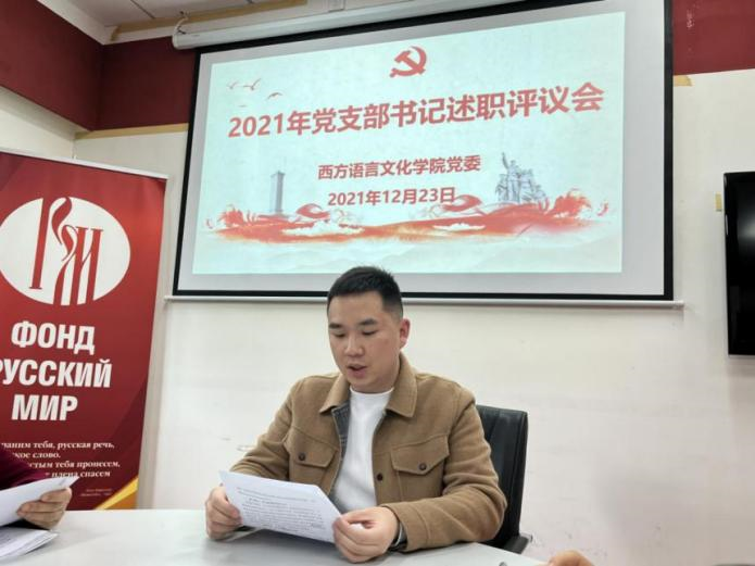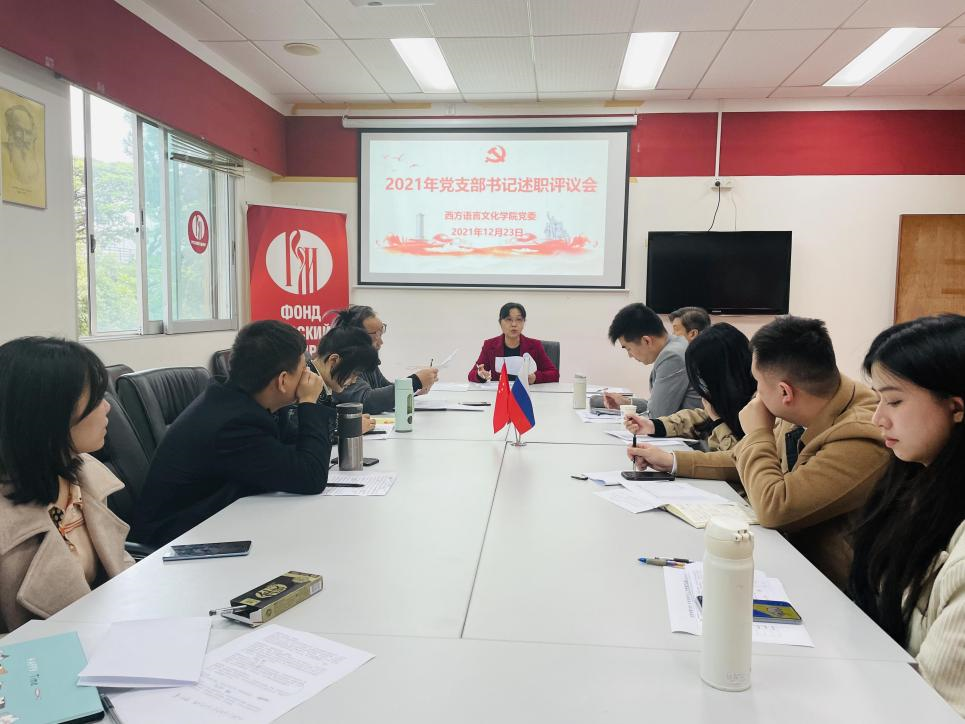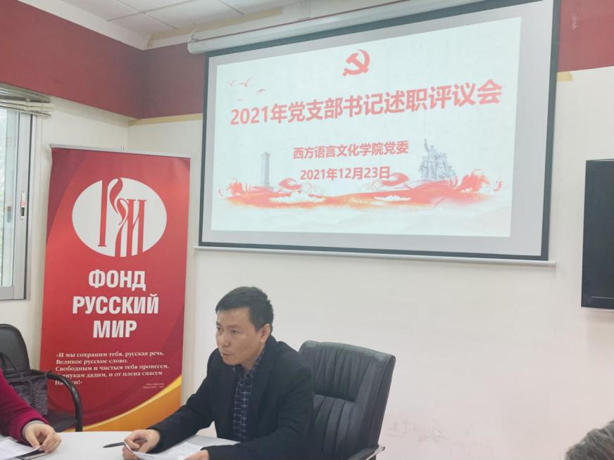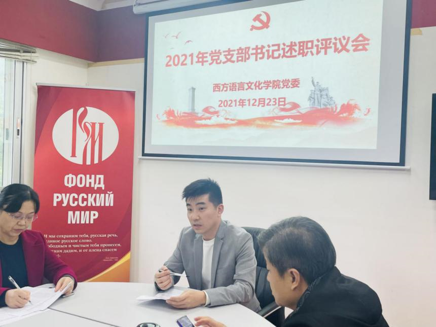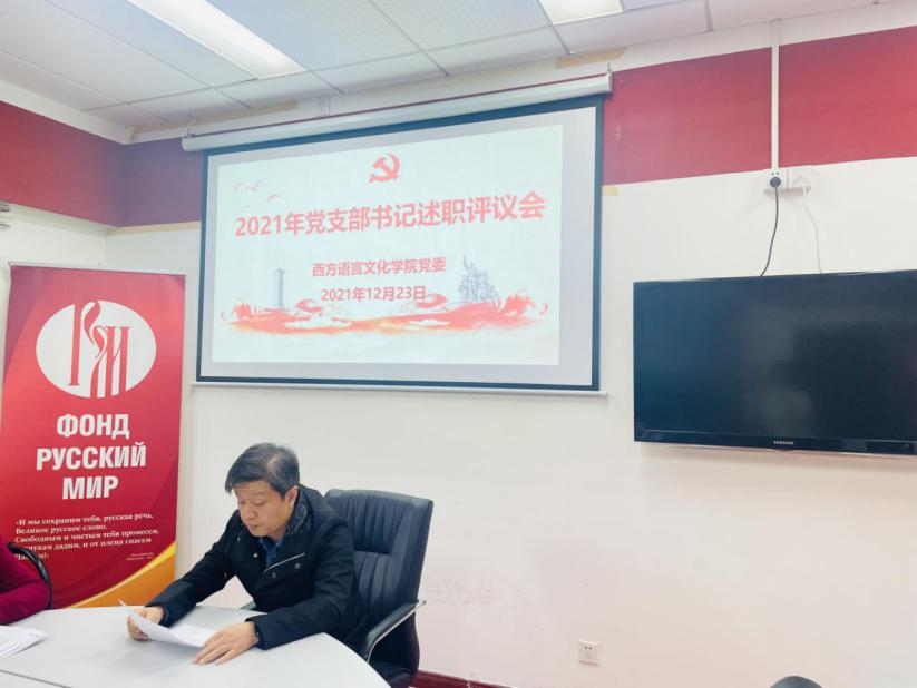 党委在俄语中心召开师生党支部书记述职评议会议,会议由学院党委书记敖湘晖主持。各党支部按照教工第一党支部、教工第二党支部、教工第三党支部、法语本科学生党支部、德语本科学生党支部、西语本科学生党支部、俄语本科学生党支部、非通用语本科学生党支部、法俄研究生联合党支部、德西研究生联合党支部的顺序依次进行述职。