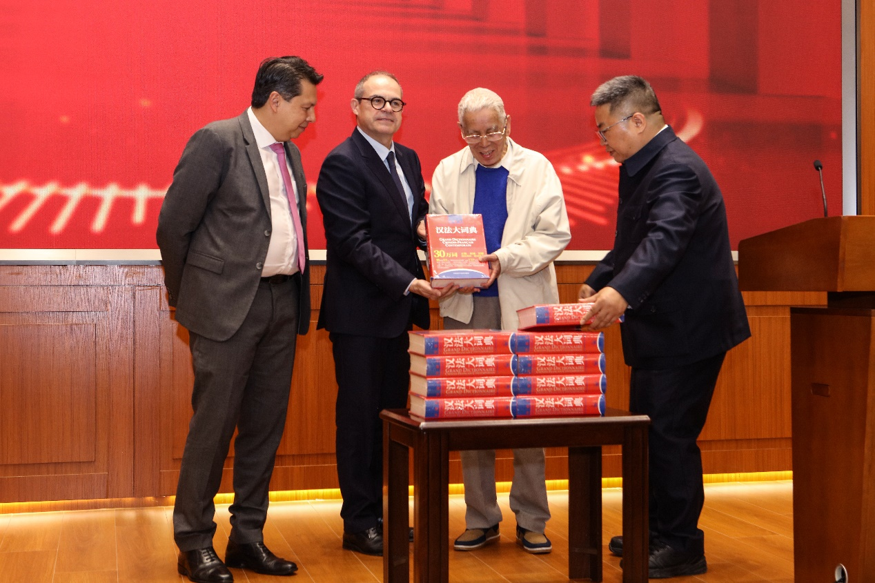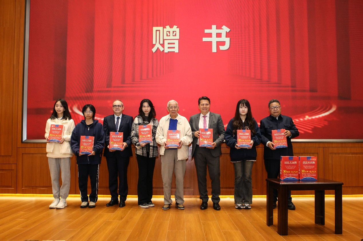 活动的收官环节是一场赠书仪式。宇佳教育总经理项晓光先生向广外法语系捐赠了《汉法大词典》,为广外法语专业学生提供更多学习资源和支持。主编黄建华校长亲自上台,为法语系大一学生代表赠书,全场掌声雷动。