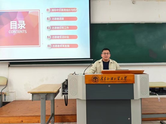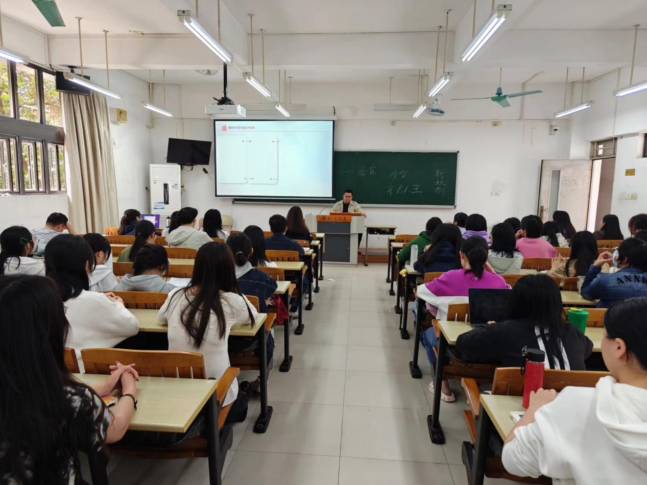 在六教B213开展题为“争做国际中文教师志愿者,为中外文化交流贡献力量”的专题讲座。讲座由法语系副教授王永康主讲,辅导员张阳主持,北校区各学院80余名学生参加。