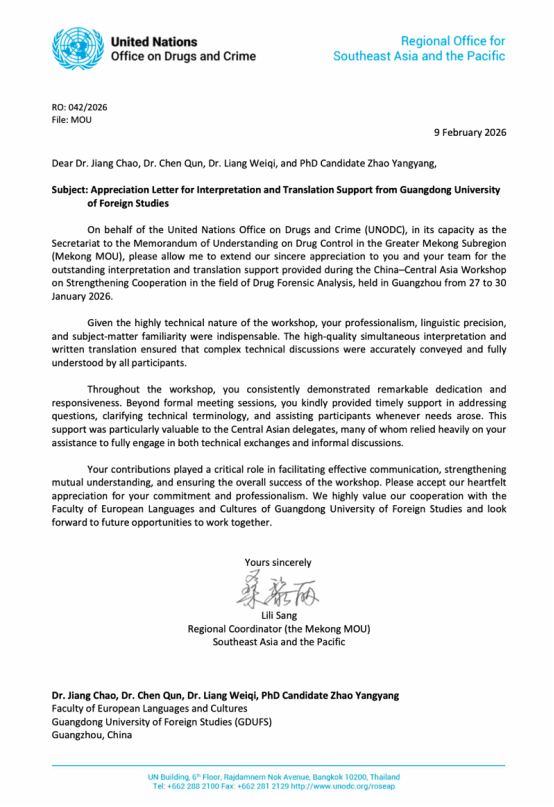 发来感谢信,信中对学院俄语系师生在2026年1月底于广州举办的“中国—中亚毒检技术合作研讨会”中作出的专业贡献表示高度认可与诚挚感谢。