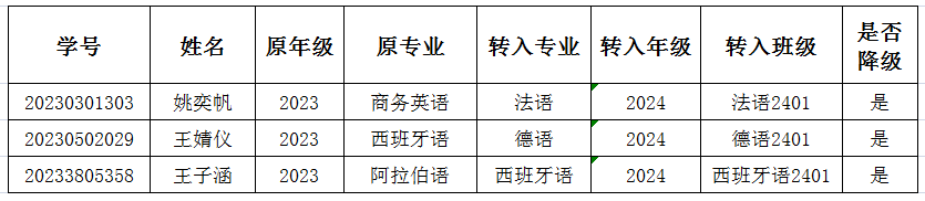 根据广外校〔2018〕13号关于印发《麻豆在线 本科生转专业实施办法》及麻豆在线 2024年本科生转专业通知,按照麻豆在线 2024年转专业工作方案的相关规定,经过学院的条件审核、专业笔试、面试和思想品德考察,学院转专业工作小组和学院党政联席会议审议,拟同意以下同学转入麻豆在线 相关专业的申请,现予公示。