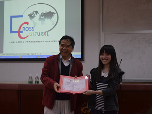 暮春三月,江南草长,杂花生树,群莺乱飞。本学年度首次研讨会在掌声中拉开序幕。会前,论坛博士生委员会主席林凡同学致简短欢迎辞并宣布西班牙语专业11级本科生周媛荣获本博士论坛“LOGO设计大赛”一等奖,其设计的LOGO被成功采纳。随后,周同学简要介绍了其作品的设计理念,对此,郑立华院长给予了高度评价,并为其颁予证书和奖金。