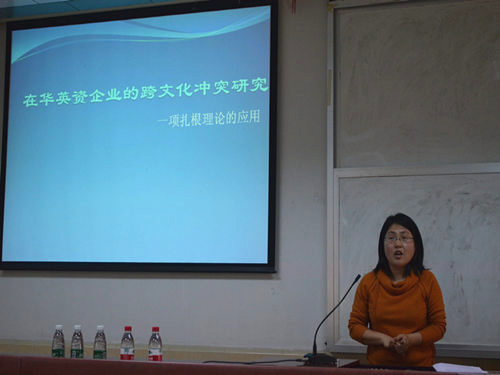 接着,本次学术沙龙的主讲人外国文学与文化中心2011级博士生黄秋凤作了题为“在华英资企业的跨文化冲突研究-一项扎根理论的应用”的演讲,她就论题的提出背景进行了阐述,并从文献、研究方法、资料分析方法、个案陈述、开放式与关联式登录及核心式登录和扎根理论的探究等方面进行了深入的解读与分析。她采用深入访谈,实地观察与分析相结合的方法收集语料,通过多份访谈和事例列举中英合资企业中的文化冲突。