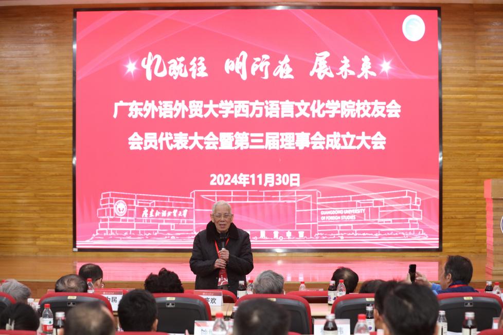 第三届理事会名誉会长、老校长黄建华教授在讲话中回顾了广外的光辉历史,和在座各位分享了学生时代的几件趣事,带领校友们回忆起学生时期的青葱岁月与难忘时光,勉励后辈继承和发扬广外人、西语人的优良传统和作风,并对学院未来发展提出希冀与期盼。